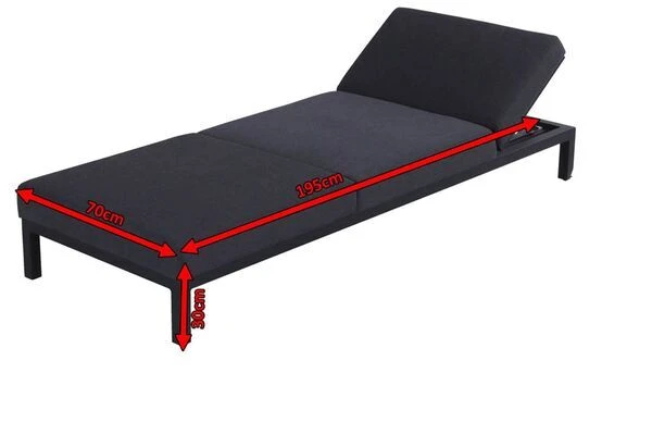 Sie bietet mit ihren Maßen von ca. 195 x 70 x 30 cm ausreichend Platz zum Entspannen und ist dabei besonders komfortabel und hautsympathisch. Außerdem kann sie sich durch ihre zahlreichen technischen Vorteile von herkömmlichen Outdoor-Liegen abheben und daher zum langlebigen Begleiter auf Ihrer Terrasse werden, an dem Sie viele Jahre Freude haben werden. Die Liegefläche ist komplett mit dem Sunbrellastoff in der klassischen Farbe “Schwarz” überzogen, welche der allgemeinen Sunbrellafarbe “Sooty” entspricht und zu allen Möbeln in dieser Farbe kombiniert werden kann. Dies wird optisch durch das ebenfalls schwarze Aluminiumgestell perfekt ergänzt. Die Rückenlehne ist 3-fach verstellbar oder kann komplett waagerecht gestellt werden. Außerdem verfügt die Liege über kleine Rollen, sodass sie je nach Bedarf beispielsweise einfach vom Schatten in die Sonne gezogen werden kann und für zusätzlichen Komfort sorgt das im Lieferumfang enthaltene komfortable Kopfkissen.