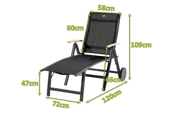 Diese Liege macht aus Ihrem Garten einen Ort der Entspannung. Die formschöne Gartenliege kann durch ihre hochwertige Verarbeitung und die Verwendung ausgesuchter Materialien überzeugen. Das stabile Gestell besteht aus Aluminium und ist somit wetterfest und äußerst pflegeleicht. Sie ist mit einem Eigengewicht von ca. 12 kg äußerst leicht und kann trotzdem mit bis zu 150 kg belastet werden. Immer der Sonne entgegen – Ob Sie lieber in der Sonne oder im Schatten liegen möchten, durch das leichte Gewicht können Sie die Liege kinderleicht verschieben. Die Armlehnen aus FSC-zertifiziertem Teakholz erzeugen eine unverwechselbare Optik und machen die Liege zu einem einzigartigen Möbelstück. Um Ihren Terrassenboden zu schützen, verfügt Sie über praktische Bodenschoner. Dank der vorteilhaften Stoffzusammensetzung der schwarzen Textilenbespannung aus 70% Polyvinylchlorid und 30% Polyester profitieren Sie von einer langen Haltbarkeit des Materials. Sie werden gar nicht mehr aufstehen wollen, denn das witterungsbeständige Material ist durch seine Flexibilität auch ohne Auflagen sehr bequem. Die Liege bietet mit seinen großzügigen Abmessungungen von ca. 190x109x72cm genügend Platz um sich zu entfalten. Sie möchten ein Schläfchen auf der Terasse halten oder ein gutes Buch lesen? Die mehrfach verstellbare Rückenlehne hilft die perfekte Liegeposition für jeden Zweck zu finden.