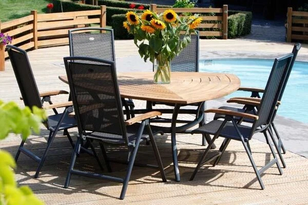 Wer seine Terrasse in neuem Licht erstrahlen lassen möchte, ist mit diesem Komplettset von Hartman bestens beraten. Es besteht aus 6 Multipositionssesseln und einem dreieckigen Esstisch, mit einer hochwertigen FSC®-zertifizierten Teakholztischplatte. Durch seine besondere Form sitzen sich alle Gäste oder Familienmitglieder gleichmäßig gegenüber, sodass gemütlichen und geselligen Abenden nichts mehr im Wege steht.