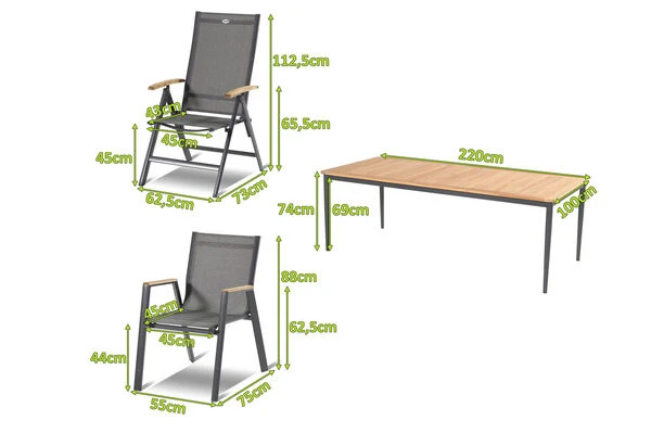 Die Sessel aus der Aruba-Serie von Hartman werden Sie mit der qualitativ hochwertigen Verarbeitung und der Verwendung ausgesuchter Materialien überzeugen. Das Gestell aus robustem Aluminium sorgt für ein geringes Eigengewicht von nur ca. 3,4 kg bzw. 4,6 kg, sodass sich die Sessel kinderleicht verschieben lassen. Trotzdem können diese mit bis zu ca. 130 kg belastet werden. Die schlichte Optik, mit dem pulverbeschichtetem Aluminiumrahmen in xerix, den Armlehnen aus Teakholz und der besonderen Textilenbespannung machen die Sessel zu einem besonderen Hingucker. Dank der Stoffzusammensetzung aus 70% Polyvinylchlorid und 30% Polyester profitieren Sie von einer langen Haltbarkeit. Sie werden gar nicht mehr aufstehen wollen, denn das witterungsbeständige Material ist durch seine Flexibilität auch ohne Auflagen sehr bequem. Ob Sie beim Essen ganz aufrecht sitzen möchten oder sich in der Sonne zurücklehnen wollen, Sie finden dank der 6-fachen Verstellbarkeit der Multipo immer die richtige Sitzposition. Ebenso schnell und unkompliziert können Sie diese zusammenklappen, sowie die Dining Sessel einfach stapeln und platzsparend verstauen.