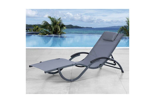 Das solide und formschöne Gestell mit den Maßen von ca. 178 x 64 x 43 cm besteht aus edlem, anthrazitfarbenem Aluminium und lässt sich an der Rückenlehne in 4 Positionen verstellen. Die graue Sitz-/Liegefläche mit einer Sitzbreite von 64 cm wird aus hochwertigem Outdoorgewebe gefertigt.