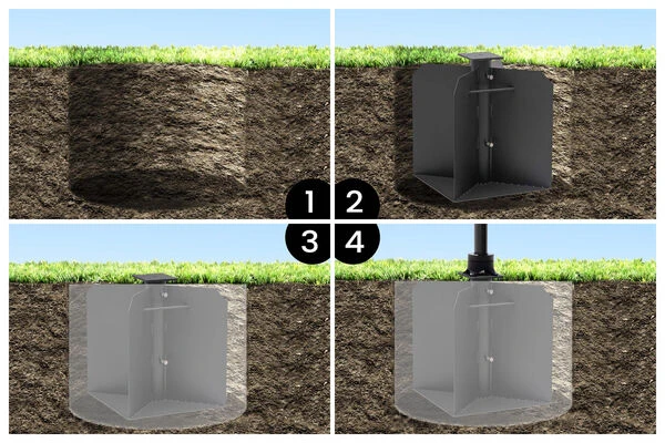 Der Bodenanker mit den Maßen von ca. 50 x 50 x 63 cm ist eine platzsparende Alternative zum Platten bzw. Schirmständer und minimiert die Stolperfallen in Ihrem Garten oder auf Ihrer Terrasse. Der Drehteller des Sonnenschirms oder das Standrohr werden zur Befestigung einfach auf den Bodenanker geschraubt und schon hat der Sonnenschirm einen festen Halt. Viele OUTFLEXX® Ampelschirme, vor allem die Luxus Variante und die Schneider Schirme aus den Serien Rhodos und Samos können direkt auf dem Bodenanker montiert werden. Sollten Sie bereits einen anderen Schirm zuhause haben, können Sie die praktische OUTFLEXX® Adapterplatte nutzen. Der Bodenanker eignet sich zum Einbetonieren oder zum Eingraben in Mutterboden. Zum Einbetonieren benötigen Sie ein Betonfundament in der Größe von mind. ca. 50 x 50 x 63 cm.