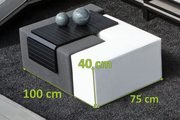 Dieser Tisch von OUTFLEXX® ist ein wahres Multitalent, ob sie ihn nun als zusätzliche Sitzmöglichkeit oder als praktischen Loungetisch nutzen möchten. Der Tisch hat ein Gesamtmaß von ca. 100 x 75 x 40 cm. Der Oberstoff in der Sunbrellafarbe sooty und natte white unterstreicht den einzigartigen Charakter der Möbel. Besonders hervorzuheben ist, dass der Tisch aus zwei Elementen besteht, sodass Sie den Tisch individuell nach Ihren Wünschen zusammenstellen können. Für das Gestell wird robustes, pulverbeschichtetes Aluminium verwendet, welches mit der Schaumstoff-Sunbrella Kombination eine solide Sitz- und Liegemöglichkeit bietet.