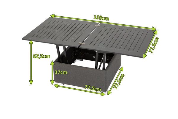 Quadratisch, praktisch und stylisch: Dieser edle Würfel besticht nicht nur durch seine Optik, auch seine inneren Werte werden Sie überzeugen. Das kleine Multitalent mit Ausgangsmaßen von ca. 77,5 x 77,5 x 37 cm ist ideal als Kaffee- oder Loungetisch einsetzbar. Bei Bedarf lässt er sich mit einem einfachen Mechanismus in einen Esstisch verwandeln und vergrößert damit seine Maße auf ca. 155 x 77,5 x 61 cm und bietet großzügig Platz für 4 Personen. Klappen Sie einfach die Tischplatte auf und ziehen Sie das Scherengestell hoch – fertig! So steht einem leckeren Brunch oder auch der nächsten Dinner-Party im kleinen Kreise nichts im Wege. Für die einzigartige Optik sorgt das hochwertige Sunbrella-Gewebe in der Farbe “sooty”, mit dem das Aluminium-Tischgestell in anthrazit umspannt wird. Sunbrella ist hautsympathisch und selbst ein verschüttetes Getränk macht ihm nichts aus. Ergänzt wird das Gestell mit einer modernen ca. 1,5 cm dicken Tischplatte aus Aluminium in anthrazit. Sie ist robust, pflegeleicht und dazu noch wetterfest und verleiht dem Tisch einen edlen und modernen Look. Die einzigartige Materialkombination des Tisches wertet jeden Loungebereich auf und wird Sie und Ihre Gäste begeistern.