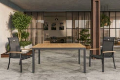 Die hochwertige Verarbeitung macht die Bank strapazierfähig und robust, mit einem Gewicht von ca. 19,2 kg ist sie auch stabil und wertig. Das FSC®-zertifizierte Teakholz ist besonders witterungsbeständig und schützt bei wechselnden Wetterverhältnissen. Das Holz hat außerdem einen natürlichen Schutz gegen Pilze und andere Schädlinge, sodass sich die Pflege der Bank auf ein Minimum beschränkt und Sie Ihre Zeit im Garten mit den schönen Dingen des Lebens verbringen können. Das solide und formschöne Gestell besteht aus edlem, pulverbeschichtetem Aluminium in dunkelgrau, das jedem Wetter trotzt. Die zusätzlichen Fußkappen vermeiden unschöne Kratzer auf Ihrer Terrasse. Kombinieren Sie die Sitzbank mit weiteren Gartenmöbeln von OUTFLEXX® und stellen Sie sich Ihren neuen Lieblingsplatz ganz nach Wunsch zusammen. Die Produkte der Marke bestechen vor allem durch ansprechendes Design, Robustheit der Materialien und Pflegeleichtigkeit – sie sorgen für ein absolutes Wohlfühlambiente in Ihrem Garten. Die Qualität wird Sie begeistern und Sie werden sich viele Jahre daran erfreuen.
