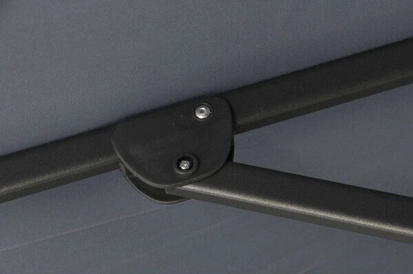 Der Schirm wiegt ca. 20 kg und wird exklusive Schirmständer ausgeliefert. Daher wird empfohlen einen Ständer mit einem Mindestgewicht von ca. 90 kg separat zu erwerben. Der Lochabstand der Verbindungsplatte (relevant für Bohrung des Schirmständers) beträgt ca. 113 mm.
