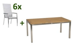 6x Stapelsessel Cardiff, silber gepolstert, Edelstahl/Textilen/Aluminiumarmlehnen, ca. 68,5x56x110 cm (416899) 1x STERN Ausziehtisch, silber/natur, Edelstahl/FSC-Teakholz, ca. 162/220x90x75 cm, Butterfly-Auszug (417379)