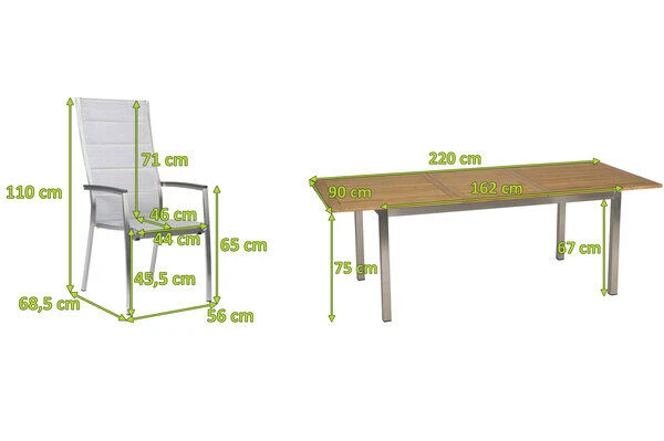 STERN Cardiff Esstischgruppe, silber, Edelstahl/Textil/FSC-Teakholz, Ausziehtisch 162/220 x 90 cm, 6 Stapelsessel