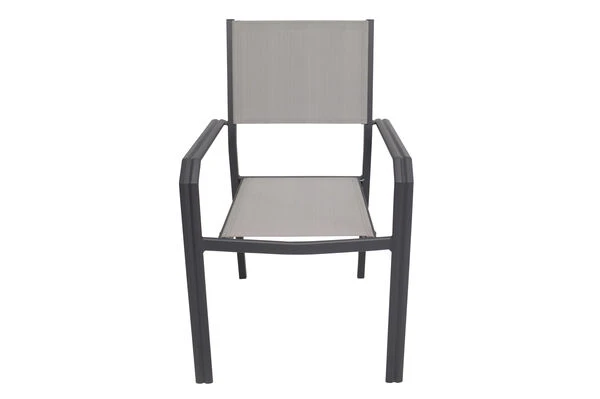 Diese Esstischgarnitur besteht aus einem Gartentisch und 6 bequemen Sesseln – perfekt, für eine gemütliche Runde aus Freunden, Familie oder Nachbarn. Bei Bedarf können Sie diese Gruppe mit passenden Artikeln der VILLANA Serie erweitern. Die Stapelsessel sind elegant und praktisch zugleich! Die Sessel haben ein Gestell aus pulverbeschichtetem Aluminium in der Farbe Anthrazit und Maße von jeweils ca. 58 x 57 x 90 cm. Aluminium ist ein gern verwendetes Material im Gartenmöbelsektor, da es besonders leicht, zeitgleich jedoch sehr stabil ist. Dazu kommt der geringe Pflegeaufwand durch die Pulverbeschichtung. Die meisten Verschmutzungen lassen sich unkompliziert mit Wasser aufweichen und anschließend abspülen oder mit einem weichen Schwamm entfernen. Bei Nichtgebrauch lassen sich die Sessel stapeln und platzsparend verstauen. Dazu ist das Leichtgewicht mit ca. 2,9 kg besonders stabil und beeindruckt mit einer maximalen Belastbarkeit von ca. 160 kg. Dabei kommt der Komfort nicht zu kurz! Die geteilte Sitz- und Rückenfläche ist mit dem modernen Material Textilene (70% Polyvinylchlorid, 30% Polyester) in der Farbe Grau bespannt. Das Kunststoffgewebe zeichnet sich vor allem durch seine hohe Belastbarkeit und seinen hohen Komfort aus. Zudem ist es frost- und hitzebeständig, was zusammen mit der hohen Lichtbeständigkeit für eine lange Attraktivität Ihrer Sitzmöbel sorgt. Auch nimmt Textilene kaum Feuchtigkeit auf, so dass die Sitzfläche nach einem Regenschauer schnell wieder trocken ist. Mit einer Sitzhöhe von ca. 42 cm und einer Sitztiefe von ca. 46 cm wollen Sie aus diesem Stuhl gar nicht mehr aufstehen!